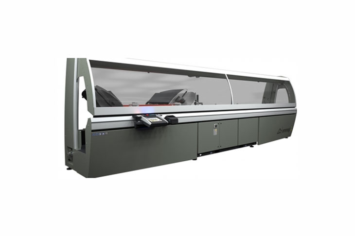 Masina de taiat cu doua capete cu 5 axe controlate pentru profile din aluminiu, PVC si aliaje usoare, cu miscarea automata a capului mobil si controlul electronic al tuturor unghiurilor de la 22°30’ (interior) la 45° (exterior), cu precizie din grad in grad (280 pozitii).
